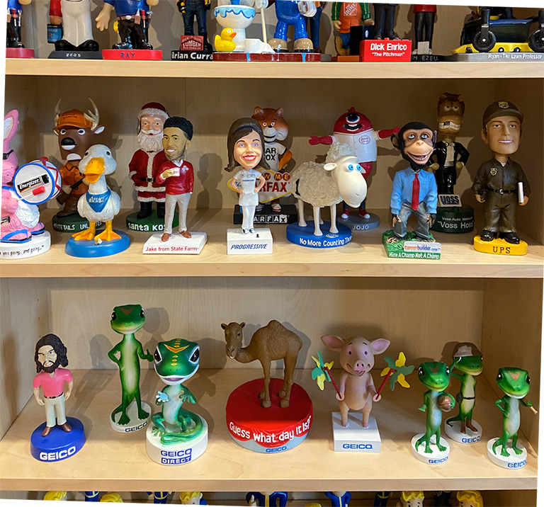 Take a gander at these fabulous insurance wobblers that are on display at the National Bobble Head Hall of Fame and Museum. If any CO readers have been there, drop me a note and we can swap stories.