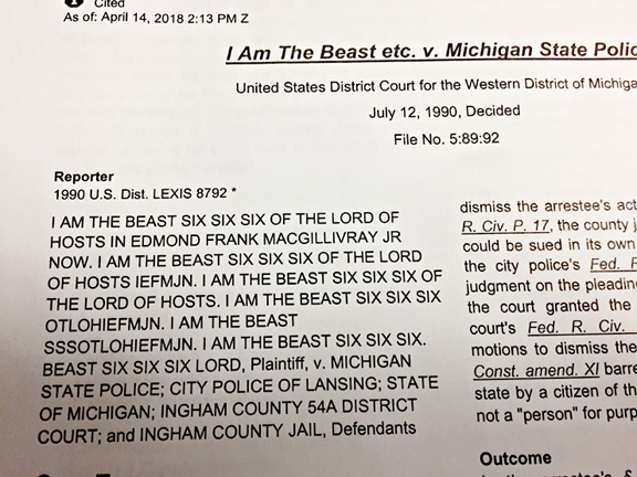 The Plaintiff maintains that this is his actual name, having purportedly renounced his given name. In a footnote, the court mentioned that it would refer to plaintiff as “I am the beast.” Good idea.