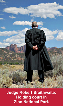 In addition to Utah’s national parks, Judge Braithwaite’s jurisdiction includes the state’s other vast federal lands, such as that owned by the U.S. Forest Service, Bureau of Land Management and the popular Lake Powell. It’s a huge territory, covering 28,000 square miles. Plus he is responsible for federal crimes committed on state land, such as bank robbery and certain drug offenses. To mete out justice, Braithwaite “rides the circuit,” spending one day a month in four locations around the state. And these are not trips around the block. To get to Big Water, where he hears cases emanating from Lake Powell, Braithwaite travels 150 miles – “none of it freeway,” he points out. “I drive over a mountain range, down into a valley and then the second half I’m driving across the desert.” His drive to Moab to hear cases is 300 miles.
